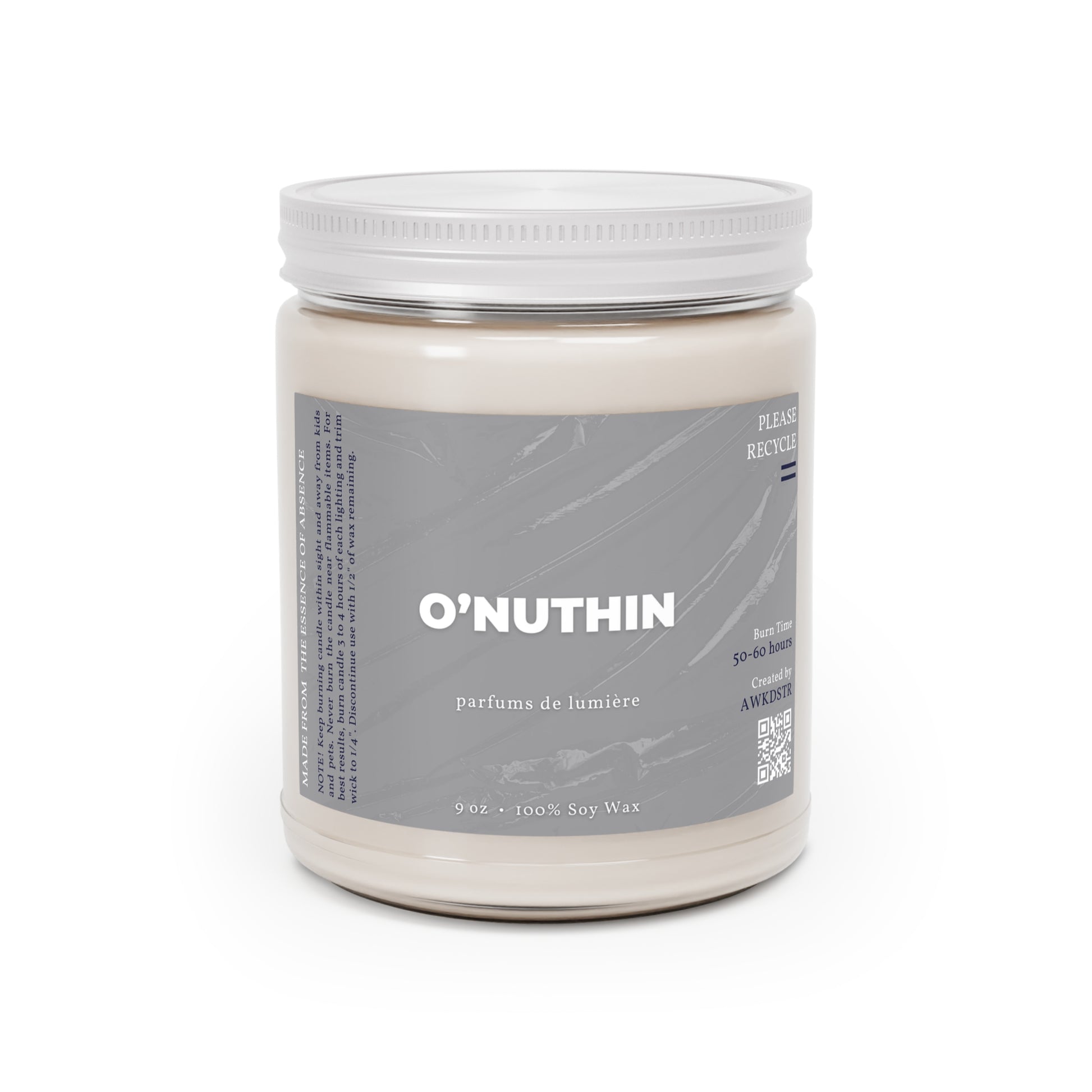 O'NUTHIN is made 100% with a natural soy wax blend and cotton wick. This unscented fragrance smells like nothing.